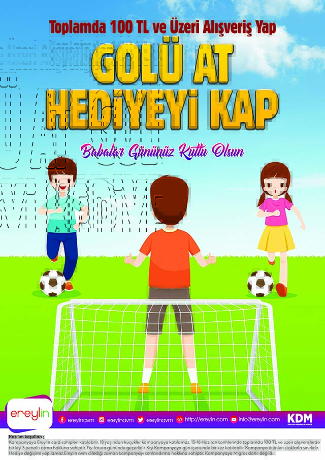 Ereylin Alışveriş merkezinde 15-16 Haziran tarihlerinde Golü At hediyeyi kap kampanyası düzenlenecektir.15-16 Haziran tarihlerinde toplamda 100 TL ve üzeri alışveriş yapan ziyaretçilerimiz 3 penaltı atma hakkı kazanacaktır .Golü atan ziyaretçilerimize ekranda çıkan hediyeler anında verilecektir.