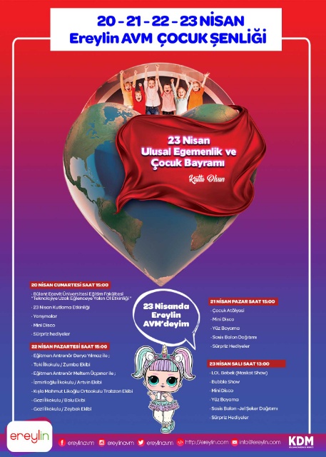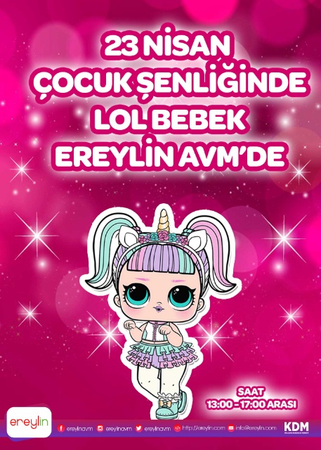 Ereylin Alışveriş Merkezi, 23 Nisan Ulusal Egemenlik ve Çocuk Bayramı kapsamında gerçekleştirilecek olan “20-21-22-23 Nisan Çocuk Şenliği” etkinlikleriyle ve 23 Nisan günü LOL Bebek Maskot Showu ile çocuklara unutulmaz anlar yaşatacak.Ayrıca 23 Nisan Ulusal Egemenlik ve Çocuk Bayramı’nda Ereylin Avm’ye gelen çocuklarımızı sürpriz hediyeler bekliyor.
