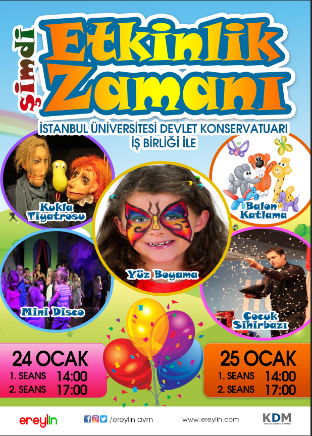 "24-25 Ocak Salı ve Çarşamba günleri Alışveriş Merkezimizde İstanbul Üniversitesi Devlet Konservatuarı iş birliğimiz ile Kukla Tiyatrosu, Çocuk İllüzyonu, Balon Katlama, Yüz Boyama Ve Mini Disco etkinliğimiz olacaktır. Çocuklarımızın sömestre tatilinde güzel vakit geçirebilmeleri için düzenlediğimiz ücretsiz etkinliğimize tüm ziyaretçilerimizi bekliyoruz."