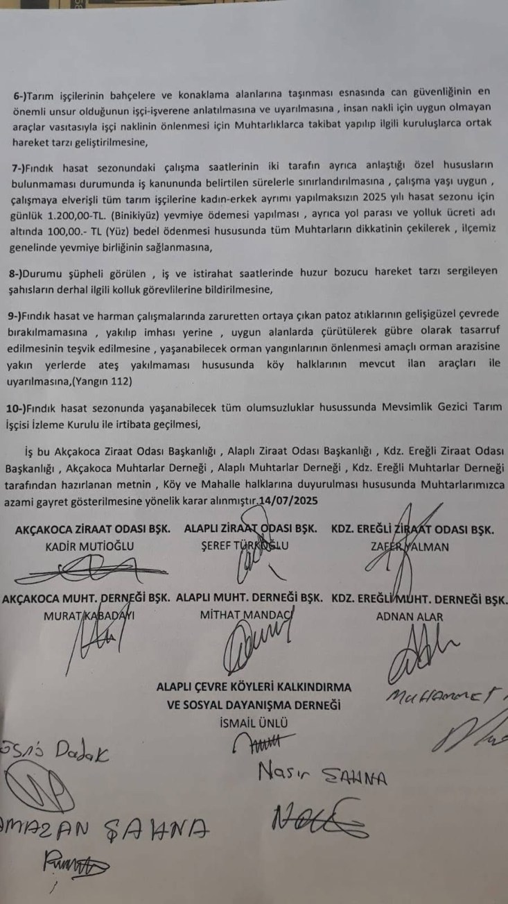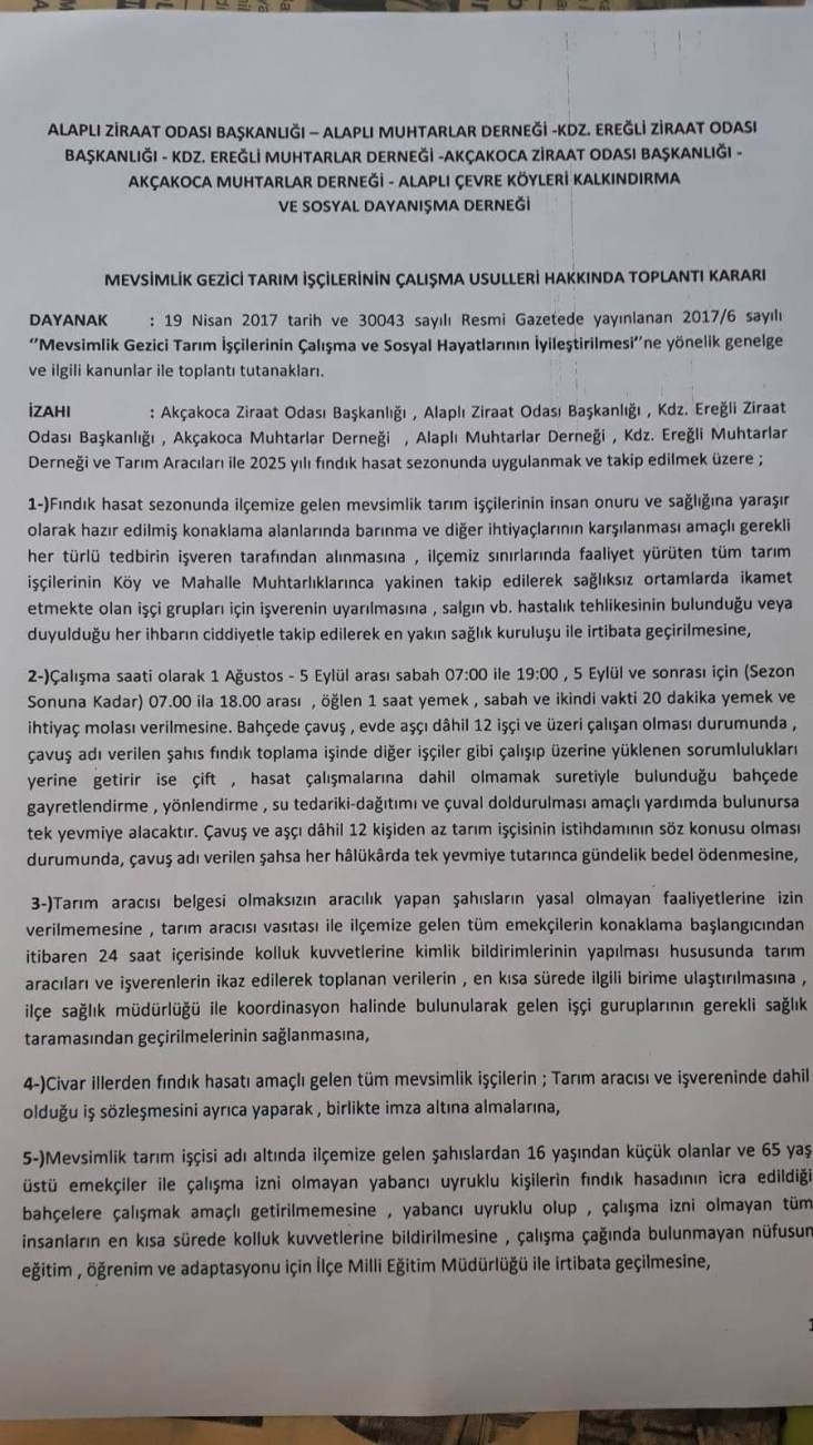 Kdz Ereğli Ziraat Odası, Alaplı Ziraat Odası, Akçakoca Ziraat Odası Alaplı Muhtarlar Derneği, Akçakoca Muhtarlar Derneği,Kdz. Ereğli Muhtarlar Derneği, Alaplı Çevre köyleri kalkındırma ve sosyal dayanışma derneği'den oluşan komisyon ortak karar alarak, 2025 yılı mevsimlik tarım işçileri yevmiyeleri konusunda tarım aracıları (dayıbaşları) ile anlaşmaya vardı.