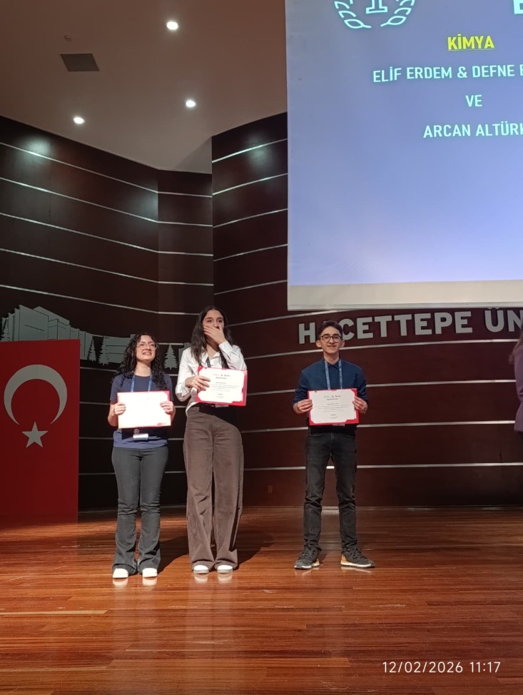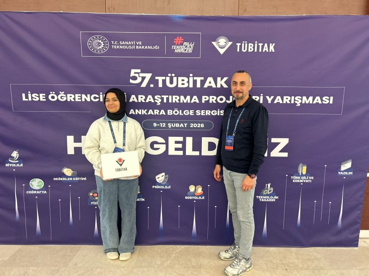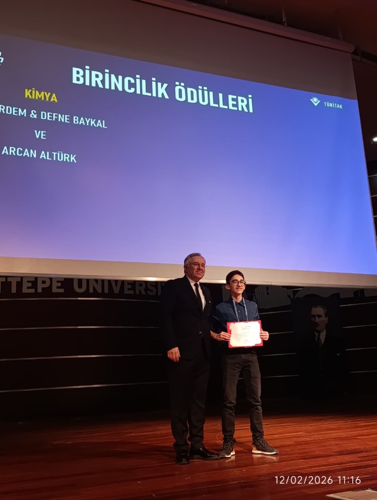 Kimya alanında öğrencimiz Arcan Altürk, danışman öğretmeni Gürol Keserci rehberliğinde hazırladığı “Evsel Atık Tabanlı Biyoadsorbanlarla Sudaki Ağır Metal (Pb+2) Kirliliğinin Giderilmesi” adlı proje ile Ankara Bölge Birincisi oldu.