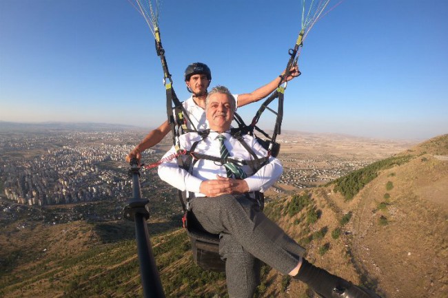 Kayseri Valisi Gökmen Çiçek ve İl Jandarma Komutanı Yüksel Yiğit'in ardından MHP İl Başkanı Adnan İncetoprak'da turizme destek vermek için yamaç paraşütü ile uçtu.