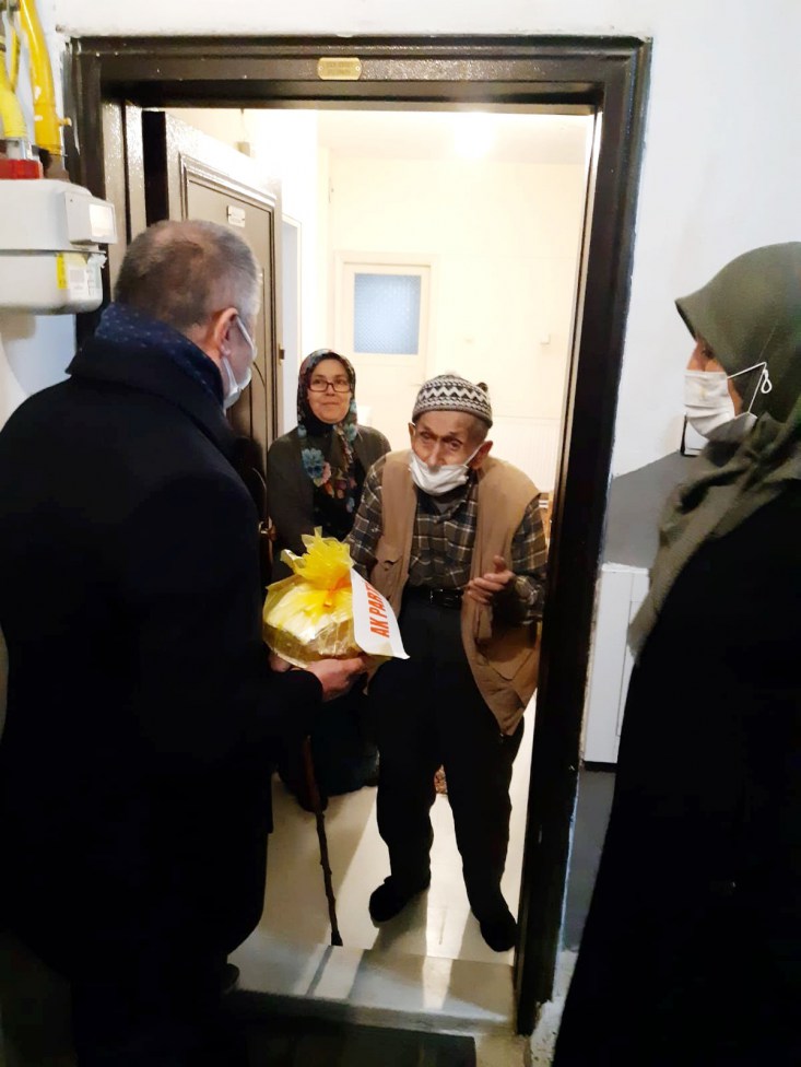 AK Parti İlçe Başkanı Saffet Bozkurt, İlçe Kadın Kolları Başkanı Fadime Doğru ve Yönetim Kurulu Üyeleri tarafından yapılan ziyaretlerde; yaşlılara üzerinde ‘Ya Rabbi! Yaşlılara her daim hürmet etmeyi lütfet. Bizlere yaşlandığımızda, bize hürmet edecek gençler halket’ duası bulunan maske dağıtılarak, Kadın Kolları tarafından hazırlanan keklerden ikram edildi.