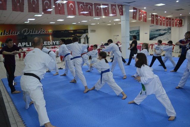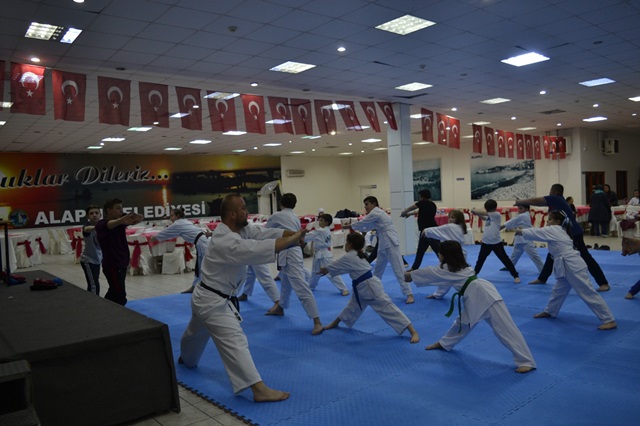 Alaplı ilçesinde Aktif Spor Kulübüne bağlı 100'e yakın karateci, kapalı spor salonunda antrenman yapamayınca, Alaplı Belediye Başkanı Nuri Tekin düğün salonunu çocukların spor yapabilmeleri için açtı.