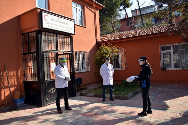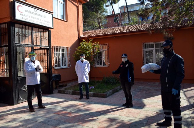 Alaplı Belediye Başkanı Nuri Tekin, salgından dolayı kullanımı artan maskeleri bu süreçte fedakarca çalışan sağlık çalışanlarına da ulaştırdıklarını belirterek, “1 Nolu Aile Sağlık Merkezi ve 2 Nolu Aile Sağlık Merkezlerinde görevli Aile hekimlerimize maskelerini teslim ettik. Fedakarca çalışan sağlık çalışanlarımızı ve sağlık merkezilerine muayene olmak için gelen vatandaşlarımızı maskesiz bırakmak istemiyoruz. Sağlık merkezilerine düzenli olarak maske dağıtımına devam edeceğiz. Tüm Alaplılı hemşerilerimizin başta kendi sağlıkları olmak üzere, ailesinin, yakınlarının, sevdiklerinin de sağlığını düşünerek hareket etmelerini rica ediyoruz. Bu doğrultuda bütün vatandaşlarımızın en başta evlerinden çıkmamalarını, eğer çıkmak zorundularsa mutlaka maske kullanmalarını önemle hatırlatmak istiyoruz. Koronavirüs salgınına karşı mücadele ettiğimiz bu günlerde el ele vererek bu zorlu süreci hep birlikte atlatacağız.” diye konuştu.