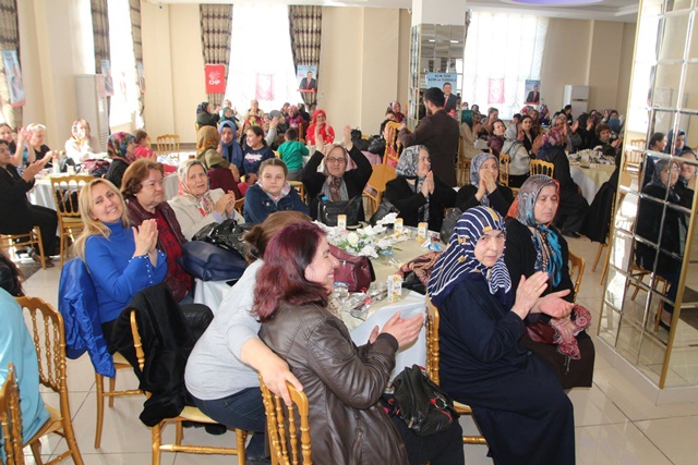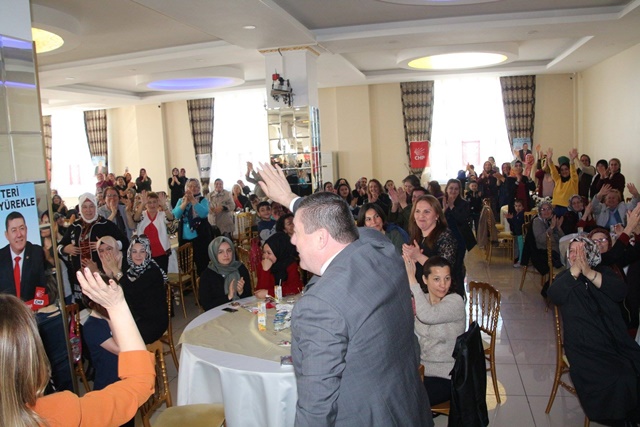 Belediye Başkanı Nuri Tekin ve Aysel Tekin el, el salona girerken salonda bulunan kadınlar alkışlarla karşıladı.Tekin, burada yaptığı konuşmada, Etkinliğe katılan bayanlarımıza ayrı, ayrı teşekkür ettiğini söyledi. Kadınlarımız bizlerin baş tacı olduğunu ifade eden Tekin, şöyle konuştu:“Bayanlarımıza etkinliğimize katıldıkları için ayrı, ayrı teşekkür ediyorum. Ben tüm kadınlarımızın günlerini kutluyorum. Bize göre senede bir gün değil, her gün kadınlar günüdür. Cennet onların ayaklarını altındadır. 2014 Martında sizlerin desteği ile Belediye Başkanı seçildim. Seçildiğim gün hemen İlçemize hizmet etmek için çalışmalara başladım. O günden bugüne hiç dinlenmeden sizlere hizmet etmek için elimden geleni yaptım. Önceliklerimiz vardı. Biz öncelikle insanlarımızın nefes alabilecekleri yerler yapmaktı. Çok çalışarak Alaplı sahilimizi yakışır şekilde yaptık. İnsanlarımız Ereğli’ye gitmekten kurtardık. Ben her zaman söylerim Zonguldak emeğin başkenti Alaplı emeklinin başkenti. Alaplı’da emekli insanımız neden Alaplı’da günlerini geçirmiyor diye hep düşündük. Onlar içinde çok güzel bir sahil yaptık. Alaplı sahilinde ailelerimiz evlerinden getirdikleri yiyecekleri burada çimlerin üzerinde kamelyalar da yiyebiliyorlar. Mangal yapıp semaverini yakabiliyorlar. Mescitte namazlarını kılabiliyorlar. Çocuk parklarında çocuklarımız eğlenebiliyor. Oltası olan balık tutabiliyor. Alaplı sahilini İlçemize yakışır şekilde yaptık. İnşallah Alaplı’da çok daha büyük ve güzel hizmetler yaptık. Eksiklerimiz var mı, tabi ki var. Onları da yapacağız.”