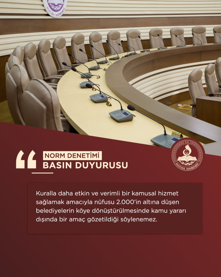 Mahkeme ise değerlendirmesinde, belediyelerin kurulması veya tüzel kişiliklerinin kaldırılmasının kanun ya da Cumhurbaşkanlığı kararnamesiyle yapılmasının anayasal bir zorunluluk olduğuna dikkat çekti. Bu kapsamda, nüfusu 2 binin altına düşen belediyelerin köye dönüştürülmesine ilişkin düzenlemenin Anayasa'ya aykırı bir yön taşımadığı belirtildi.