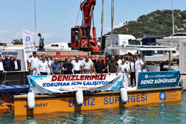 Antalya'da deniz çöpleriyle mücadele kapsamında Büyükşehir Belediyesi tarafından alınan ABB Mavi 07 isimli deniz süpürgesi deniz yüzeyindeki fiziksel çöpleri toplayacak. Güneş enerjisinden de faydalanan deniz süpürgesi, su altındaki yosunları biçebiliyor, polen, müsilaj ve petrol türevi atıkları da toplayabiliyor.