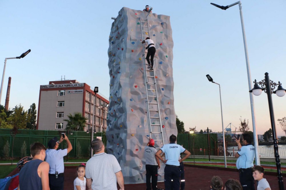 Kdz.Ereğli ilçesinde tırmanma şeridine çıkan çocuk mahsur kaldı. Vatandaşların haber verdiği itfaiye ekipleri tarafından kurtarılan küçük çocuk, tırmanma şeridinden iner inmez göz yaşlarına boğuldu. Küçük çocuğu itfaiye ve zabıta ekipleri teselli etti.