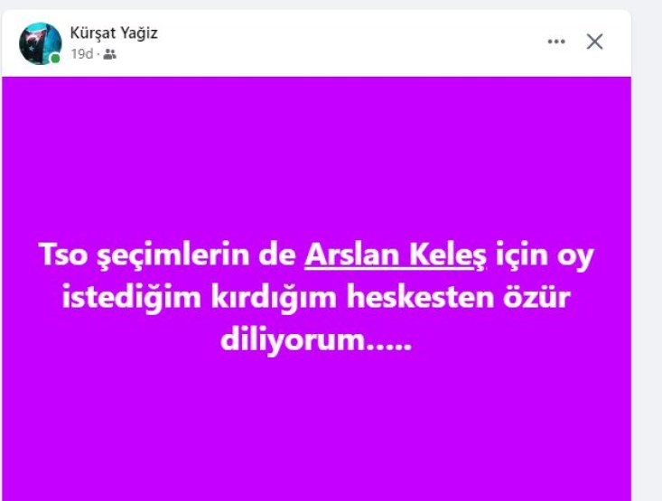 Kızılay Kdz.Ereğli Şube Başkanı Kürşat Yağız, sosyal medya hesabından bir paylaşım yaparak; "TSO seçimlerinde Arslan Keleş için oy istediğim, kırdığım herkesten özür diliyorum", dedi.