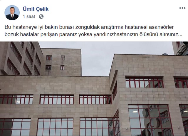 Ümit Çelik adlı vatandaş sosyal medya hesabından BEÜ Zonguldak Araştırma Hastanesi'ndeki olumsuzluklar nedeniyle isyan etti.