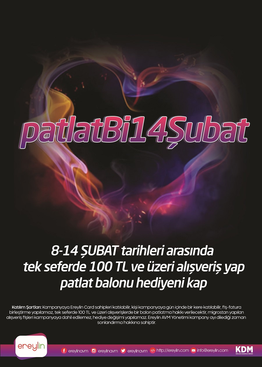 “8-14 Şubat tarihleri arasında tek seferde 100 lira ve üzeri alışveriş yapan ziyaretçilerimize dilediği balonu patlatma şansı verilerek balonun içinden çıkan hediyeyi anında kazanıyor ve balonlarımızda boş yok aynı zamanda yine 8-14 Şubat tarihlerinde ‘aşkı ile selfie’ çekip, facebookta 2 arkadaşını etiketleyip, paylaşan ve en çok beğeni alan ilk 10 çiftimize menü hediye edeceğiz. 14 Şubat Sevgililer Günü’nde ise Alışveriş merkezimizde aşkın ile yarış etkinliği food court katında saat 16:00 da başlayacaktır ilk üç çifte sürpriz hediyeler verilecektir.”