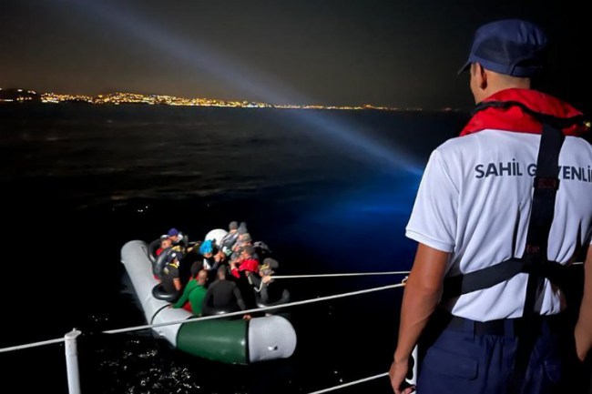 Kuşadası ilçesinde görevli Sahil Güvenlik Mobil Radarı (MORAD-13) tarafından lastik bot içerisinde bir grup düzensiz göçmen tespit edilmesi üzerine harekete geçen TCSG-74 botu hareketli lastik botu durdurarak içerisindeki 27 düzensiz göçmeni yakaladı.