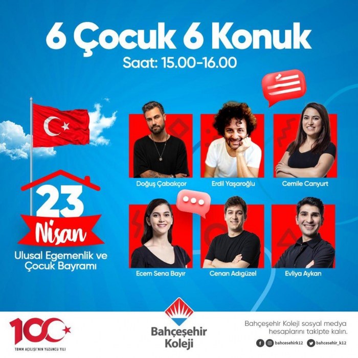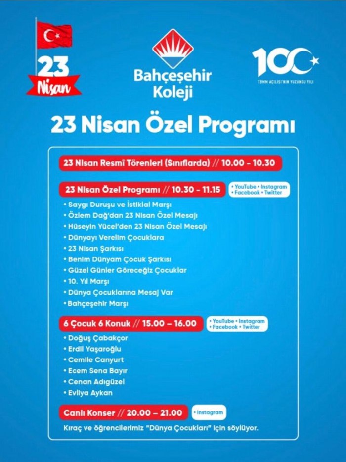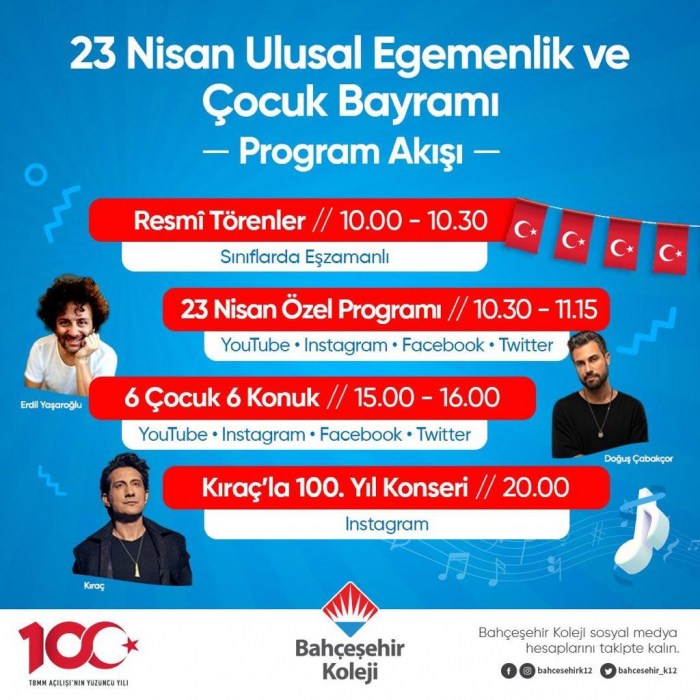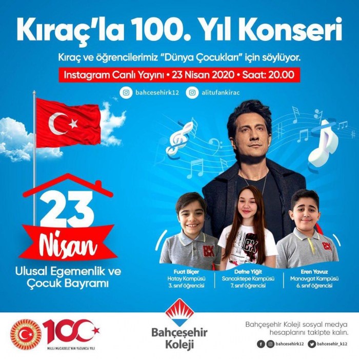 Bahçeşehir Koleji online sınıflarda sabah 10.00’da başlayarak sosyal medya hesaplarında gün boyu devam edecek olan coşkulu 23 Nisan kutlamaları, akşam 20.00’de gerçekleşecek olan “KIRAÇ’la 100. Yıl Konseri”yle taçlanacak..