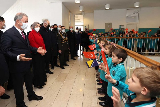 Saraybosna'daki minik öğrenciler Milli Savunma Bakanı Hulusi Akar'ın coşkulu bir şekilde karşıladı.
