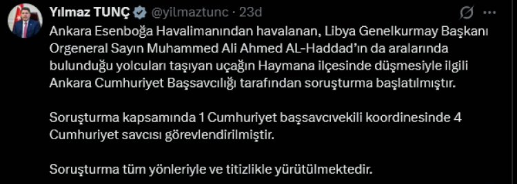Ankara Esenboğa Havalimanı'ndan havalanan ve Libya Genelkurmay Başkanı Muhammed Ali Ahmed Al-Haddad'ın da bulunduğu uçağın Haymana'da düşmesiyle ilgili Ankara Cumhuriyet Başsavcılığı tarafından soruşturma başlatıldı.