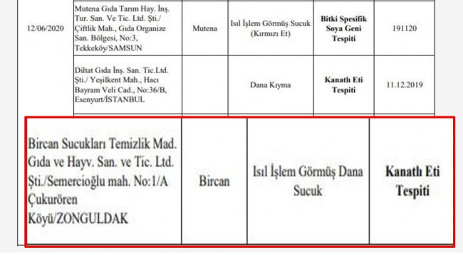 Buna göre; Zonguldak Çukurören köyünde faaliyet gösterdiği belirlenen Bircan Sucuklarında kanatlı eti tespit edildi..