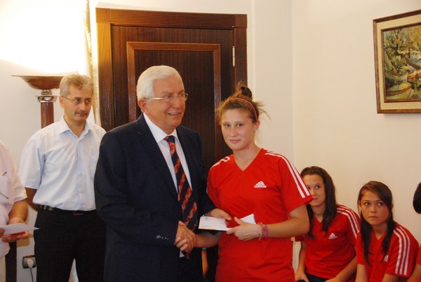 Saat 13.30’da Başkanlık Makamı’nda düzenlenen ödül törenine, Ereğli Belediyespor Bayan Futbol Takımı oyuncularının yanı sıra, Teknik Direktör Yıldıray Ağar ve bazı kulüp yöneticileri de katıldı.