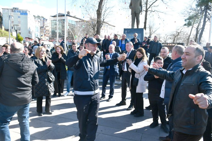 Belediye işçileri tarafından meşale ve sloganlarla karşılanan Alaplı Belediye Başkanı Nuri Tekin, salona alkışlar eşliğinde girdi.