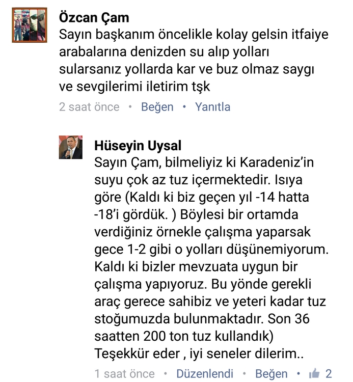 Vatandaşın sorusu üzerine Alaplı Belediye Başkanı Nuri Tekin'in geçen sene kış ayında başlattığı 'Deniz Suyu' ile yıkama formülüne de cevap veren başkan Uysal; "Bizler mevzuata uygun bir çalışma yapıyoruz. Bu yönde gerekli araçlara sahibiz ve yeteri kadar da tuz stoğumuz var", dedi..
