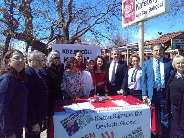 Karadeniz Ereğli’de, Ereğli Kadın Platformu tarafından, kadın sığınma evi talebiyle başlatılan kampanya Bozhane Çınaraltı mevkiinde devam etti.