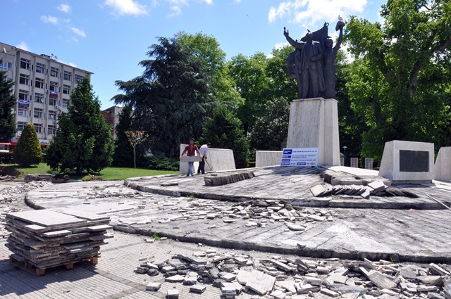 Atatürk Anıtı düzenleme çalışmaları kapsamında Atatürk Büstü Kaidesi ile rölyeflerdeki eskiyen mermerlerin söküldüğünü ve yerine traverten kaplama yapılacağını vurgulayan Başkan Uysal, anıt çevresindeki taban düzenleme çalışmalarının da sürdüğünü kaydetti.