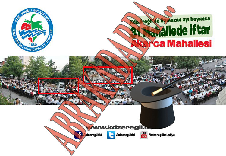 Kdz. Ereğli Belediyesi mahalledeki tüm apartmanların ilan tahtalarına davet yazısı asmasına, Akarca mahallesindeki iftara tüm Ereğli halkını anonslarla davet etmesine rağmen katılım az olunca photoshop hilesine başvuruldu...