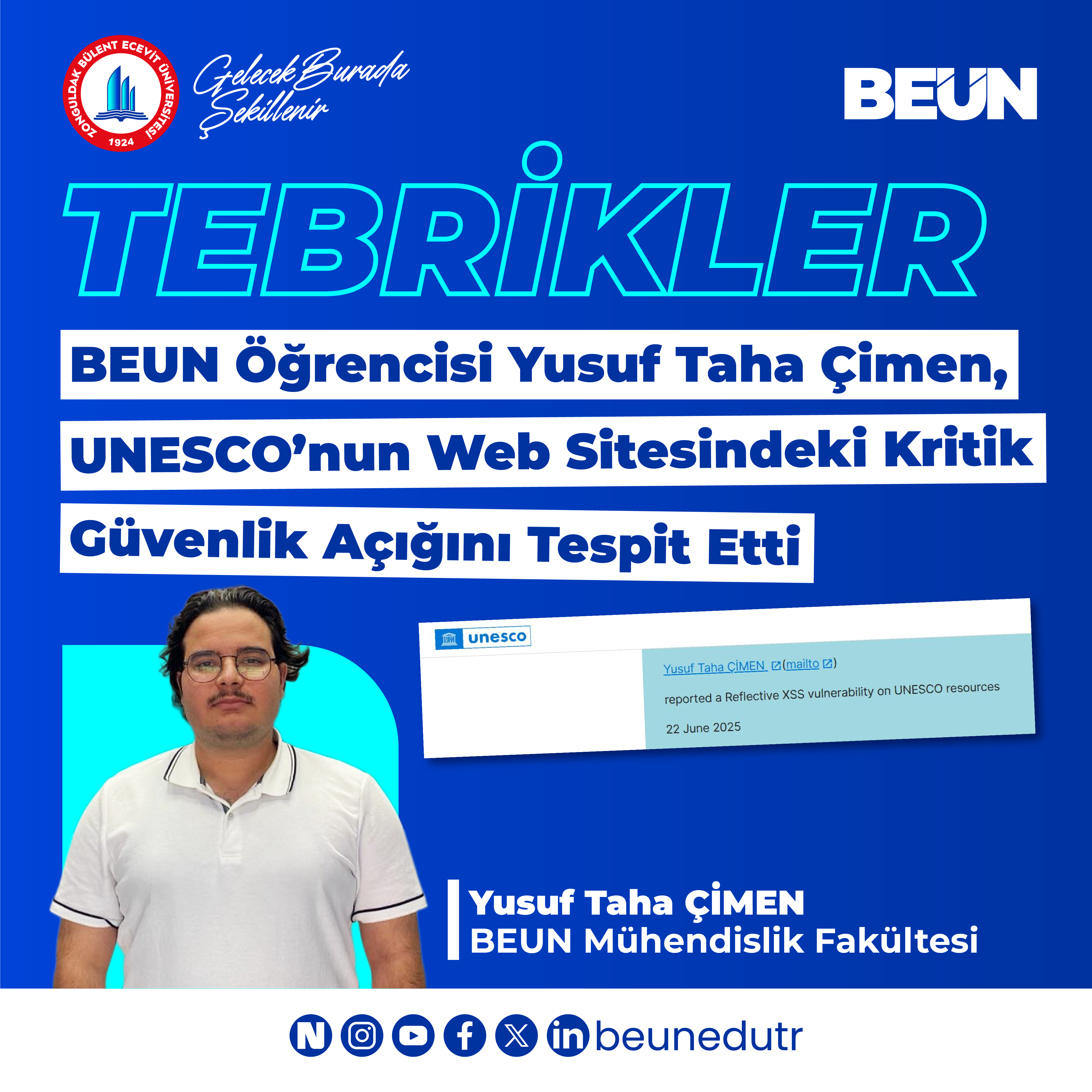 Zonguldak Bülent Ecevit Üniversitesi (BEUN) Mühendislik Fakültesi Bilgisayar Mühendisliği öğrencisi Yusuf Taha Çimen, 2 Haziran 2025 tarihinde uluslararası alanda büyük bir başarıya imza attı. UNESCO’nun resmi web sitesinde kritik bir “Reflective XSS” güvenlik açığını tespit eden Çimen, açığın raporlanmasıyla birlikte UNESCO’nun resmî sayfasında listelenerek uluslararası platformda dikkat çekti.
