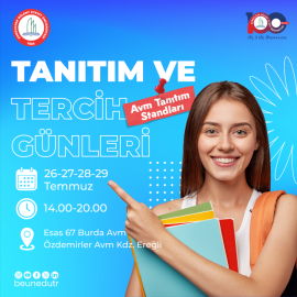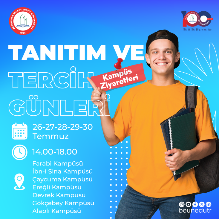 25 Temmuz-02 Ağustos 2024 tarihleri arasında gerçekleşecek olan YKS tercih döneminde BEUN tanıtım ve tercih faaliyetleri programı belli oldu.