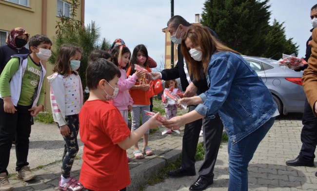 Alaplı Belediye Başkanı Nuri Tekin ve eşi Aysel Tekin, 23 Nisan Ulusal Egemenlik ve Çocuk Bayramı dolayısıyla çocuklara Türk Bayrağı ve çeşitli hediyeler vererek bayramlarını kutladı.