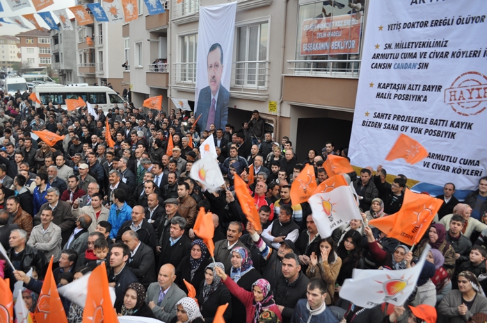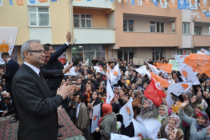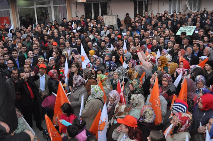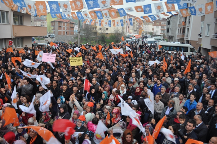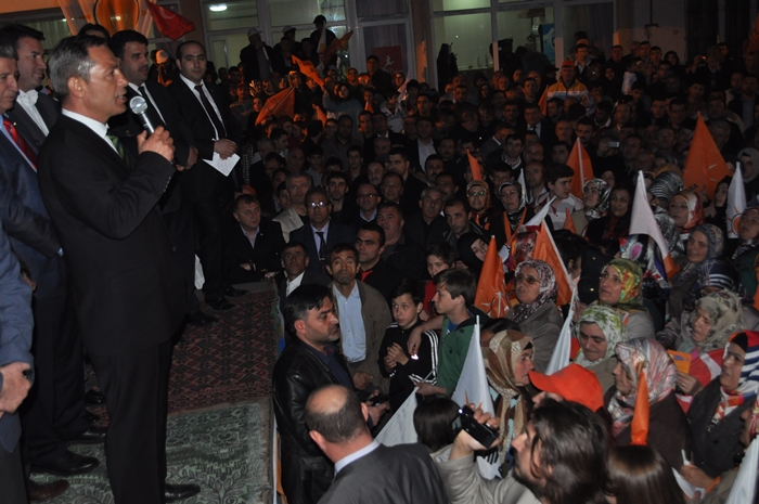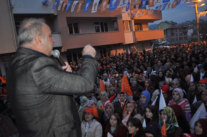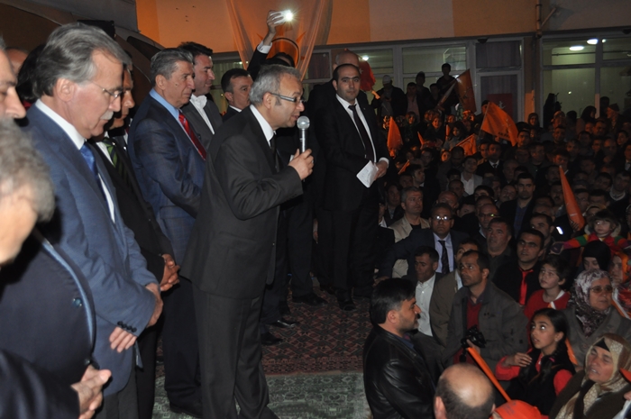 Muhalefet hata yaptı CHP, MHP ve onların yeni ortağı hata yaptı. Bu seçimi Ak partiden kurtulma Recep Tayyip Erdoğan'ın önünü kesme seçimi gibi göstermeye çalıştılar böyle bir propaganda yolu seçtiler hata yaptılar. Bilemediler ki bu milletin iradesine sahip çıkacağını bilemediler, oyuna sahip çıkacağını bilemediler, biz sandıkla getiririz sandıkla götürürüz bilincini anlayamadılar. İşte şimdi millet iktidarına sahip çıkıyor ,Başbakanına sahip çıkıyor. Önümüzdeki çarşamba günü başbakanımız Zonguldak'ta siz kardeşlerimizi mitingimize davet ediyoruz. Bütün bu oyunları bozacak bir tavır içerisinde Zonguldak meydanını hınca hınç doldurmalıyız. Neden ak parti iktidarından Recep Tayyip Erdoğan'dan kurtulmak istiyorsunuz hizmet etmek dışında ne yaptılar? Bu seçim sadece belediye seçimi değil partimize iktidarımıza 12 Haziran 2011'de ortaya koyduğumuz iradeye sahip çıkma seçimidir. Ak Parti'yi yüzde 50 oyla iktidara geldi. Biz böylesine bir tavrı pazar günü sandıkta göstereceksiniz. İnanıyoruz halkımıza güveniyoruz. İnandığınız güvendiğiniz için her girdiği seçimde oylarını artırarak Ak Partiye oy verdiniz, destek oldunuz. Ereğli'nin tarihinde yeni bir dönem yeni bir hizmet dönemi başlayacak. Ak Partinin belediyecilik anlayışını inşallah burada da göstereceğiz. Farkı zaten göreceksiniz. Biz hizmet için geldik. Bizim siyasetimiz hizmet siyasetidir. Seçimler şimdiden hayırlı uğurlu olsun Ereğli'ye, Zonguldak'a ülkemize hayırlı olsun. Bu ayın sonunda 2 şeyi unutmayın bir pazar günü tabi ki seçim var ertesi gün saatlerinizi 1 saat ileri almayı unutmayın. Niçin gün ışığından daha fazla yararlanmak için bir de Pazar günü seçimde müşterek oy pusulasının ak parti ambleminin altına evet oyu basmayı unutmayın"