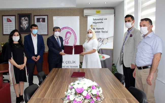 BURSA (İGFA) - NOSAB'da 20 bin metrekarelik tesisinde fabrikalardan hastanelere ve okullara kadar günde 150 bin kişiye yemek üreten Referans Catering ile Faik Çelik Mesleki ve Teknik Anadolu Lisesi arasında iş birliği protokolü imzalandı.