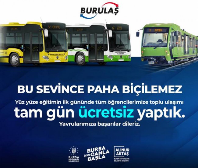 Bursa Büyükşehir Belediyesi'nden binlerce öğrenciye ücretsiz ulaşım sürprizi geldi. Bursa'da 2021 - 2022 eğitim öğretim döneminin ilk günü olan 6 Eylül Pazartesi günü otobüs ve raylı sistem araçlarına kartlarını okutarak binen tüm öğrenciler için ulaşım gün boyu ücretsiz olacak.