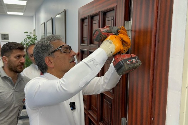 Başkan Deviren, konuşması ardından iş güvenliğinin önemine de vurgu yaparak makam kapısını kendi elleriyle söktü.