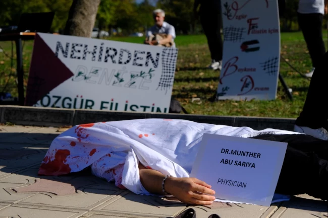 BURSA (İGFA) - Özellikle son 1 yıldır Filistin halkına karşı artarak devam eden İsrail saldırılarının yıldönümünde, Uludağ Üniversitesi Tıp Fakültesi öğrencileri yaptıkları eylemle zulüm altında görevlerini yapmaya çalışan sağlık çalışanları ve basın mensuplarının yaşadıkları insani zorluklara dikkat çektiler. Gazze'de yaşanan savaş ortamını simülasyonla canlandırmak üzere düzenlenen alana kana bulanmış çocuk kıyafetleri, oyuncaklar ve kefenlenmiş sağlık çalışanları ile basın mensupları yerleştirildi. Ses sistemi yardımı ile bomba, füze ve silah seslerinin yankılandığı alanda yaklaşık 2 saat süren eylem büyük ilgi gördü.