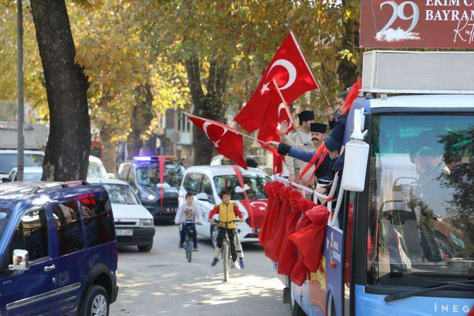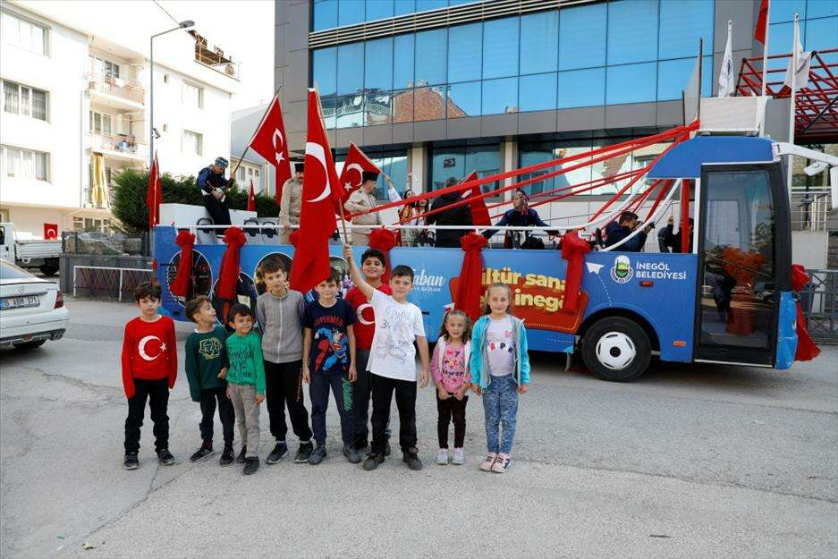 Bursa'nın İnegöl Belediyesi, 29 Ekim Cumhuriyet Bayramı etkinlikleri kapsamında kültür sanat otobüsü ile şehir turu gerçekleştirdi. Cumhuriyet coşkusu tüm şehri sardı.
