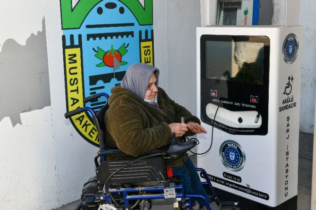 Bursa'da Mustafakemalpaşa Belediyesi, engelsiz şehir ilkesiyle gerçekleştirdiği projeler kapsamında akülü sandalye kullanan engelli vatandaşlara şarj istasyonu kurdu.