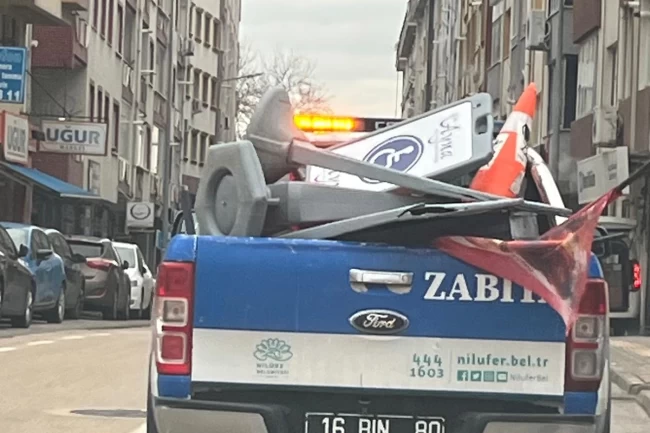 Nilüfer Belediyesi ekipleri; Esentepe ve Karaman mahalleleri ile Beşevler ve Yıldırım caddeleri üzerinde yaya geçişini engelleyen ve görüntü kirliliği oluşturan duba, tabela ve reklam materyallerini topladı.