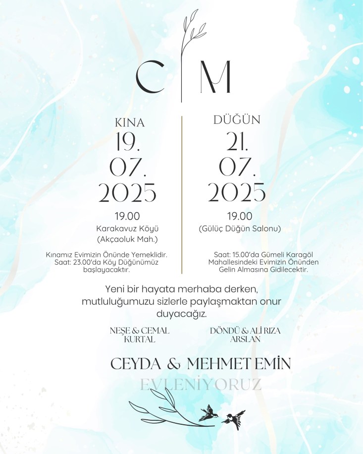 19.07.2025 tarihinde Karakavuz köyündeki evlerinin önünde kına merasimi ile başlayacak olan törenin 21.07.2025 tarihinde Gülüç Belediyesi Düğün Salonunda evlilik ile taçlandırılacağı öğrenilirken; Kurtal ailesi törene tüm sevenleri ve dostlarını davet etti.