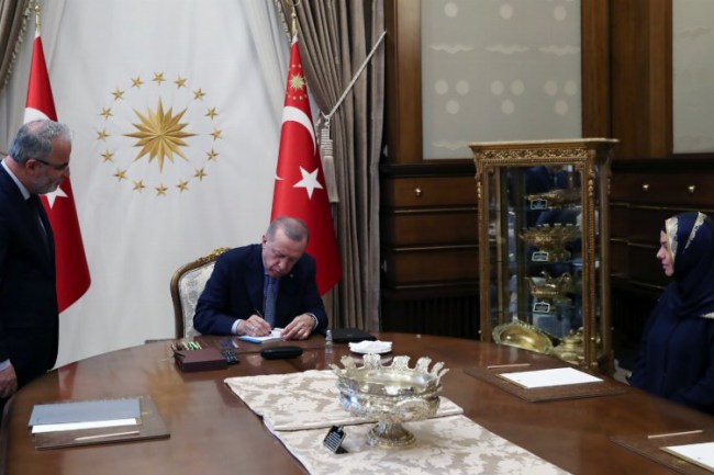 ANKARA (İGFA) - Cumhurbaşkanı Recep Tayyip Erdoğan, Diyanet İşleri Başkan Yardımcıları Burhan İşliyen ve Huriye Martı'yı Cumhurbaşkanlığı Külliyesi'nde kabul ederek kurban vekaletini Türkiye Diyanet Vakfı'na verdi.