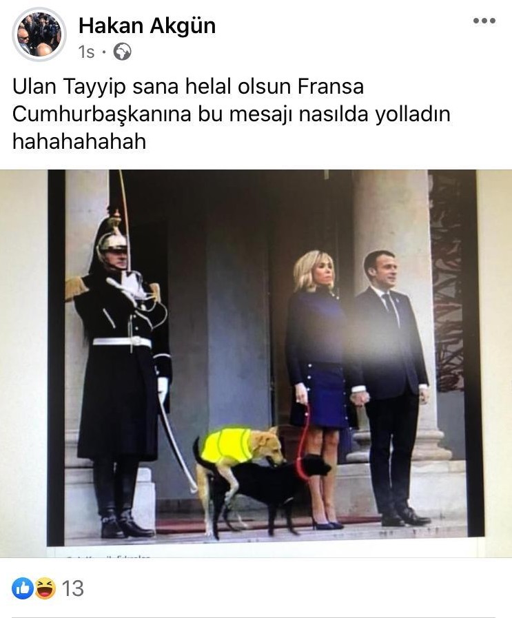 Kdz.Ereğli’de Hakan Akgün adlı şahıs 10 Eylül 2020 tarihinde kişisel sosyal medya hesabından bir paylaşım yaparak; Cumhurbaşkanı Recep Tayyip Erdoğan’a hitaben alaycı bir şekilde ‘Ulan Tayyip sana helal olsun Fransa Cumhurbaşkanına bu mesajı nasılda yolladın hahahah’, şeklinde paylaşımda bulunmuş ve paylaşımında cinsel ilişkiye giren iki köpeğin görselini kullanmıştı.