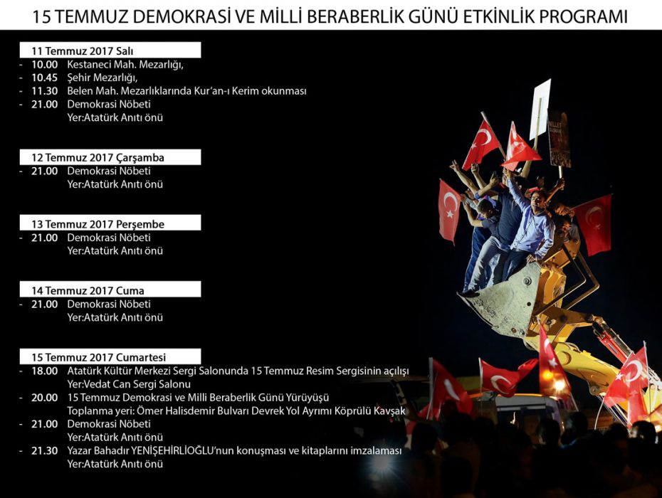 “Ereğli Belediyesi olarak, 15 Temmuz hain darbe girişiminin birinci yılında, İlçe Kaymakamlığımız ile birlikte, ‘15 Temmuz Demokrasi ve Milli Beraberlik Günü’ etkinlikleri için hazırlıklarımızı tamamlamak üzereyiz. Darbe girişiminin ardından 27 gün boyunca süren demokrasi nöbetlerinde, bir ve beraber olan siz güzel şehrimin güzel insanlarını, 11 Temmuz Salı günü saat 21.00 de Atatürk Anıtı’nda başlayacak ve program dahilinde 5 gün sürecek olan demokrasi nöbetleri ile, 15 Temmuz 2017 Cumartesi günü saat 20:00’de ilçemiz Şehit Ömer Halisdemir Bulvarı Köprülü Kavşak Bölgesinden başlayacak ‘Demokrasi ve Milli Beraberlik Yürüyüşü’ne davet ediyorum.”