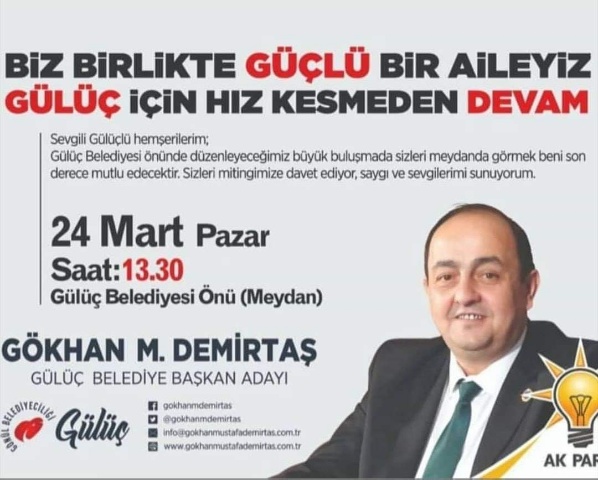 Gülüç Belde belediye Başkanı ve AK Parti belediye başkan adayı Gökhan Demirtaş, 24 Mart Pazar günü Belediye önünde düzenleyeceği mitinge Gülüç halkını davet etti