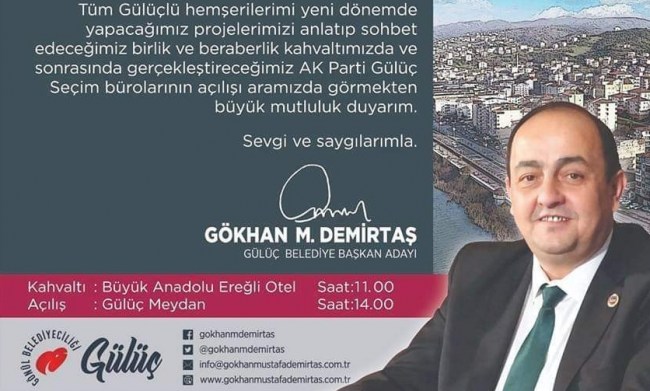 Zonguldak’ın Ereğli İlçesine bağlı Gülüç belde belediye başkan adayı Gökhan Demirtaş, 24 Şubat Pazar günü birlik beraberlik kahvaltısının ardından düzenlenecek olan ‘Seçim bürosu’ açılışıyla ilgili davette bulundu.