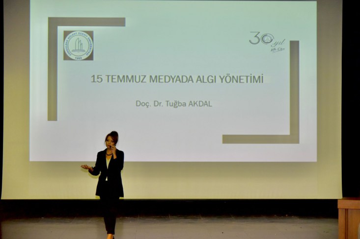 15 Temmuz şehitlerinin anısına gerçekleşen Saygı Duruşu ve İstiklal Marşı’nın okunmasının ardından başlayan konferansta, İletişim Fakültesi öğretim üyesi ve Üniversitemizin Basın, Yayın ve Halkla İlişkiler koordinatörü Doç. Dr. Tuğba Akdal, 15 Temmuz sürecine yönelik ulusal ve uluslararası medyanın tutumu ve algı yönetimi hakkında konuştu.