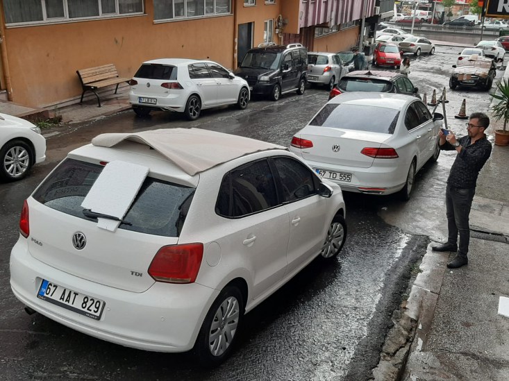 Karadeniz Ereğli ve Alaplı ilçelerinde, 16-16.30 arasında etkili olan ve bazıları fındık büyüklüğüne ulaşan dolu dakikalar sonra yerini kuvvetli sağanağa bıraktı. Durumun Ayvalık ve İstanbul’daki gibi olacağını sanan araç sahipleri ne bulduysa araçlarını örterek korumaya çalıştı.