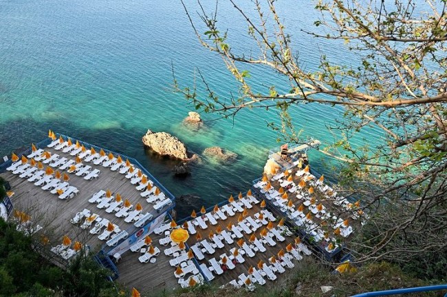 ANTALYA (İGFA) - Antalya'nın dünyaca ünlü falez sahil bandından turistleri, kent sakinlerin Akdeniz'in masmavi sularıyla buluşturan Muratpaşa Belediyesi falez plajlarından İnciraltı'nda yeni sezon başladı. Belediyenin 5 plajı içinde asansörle de inilebilen tek plaj olan İnciraltı'na bu yıl da girişler ücretsiz. Saat 06.00'da açılan ve plaj hizmetlerinin 08.00'de başladığı plajda şezlong ve şemsiye kiralama ücreti ise 100 lira.