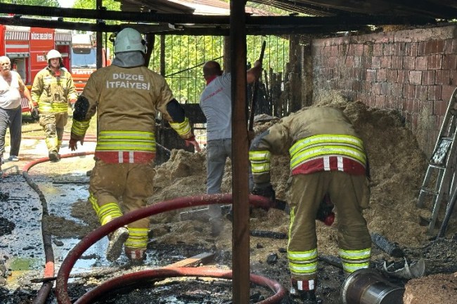 Düzce'de Otluoğlu Köyü'ndeki ahırda çıkan yangında 5 büyükbaş hayvandan 2'si telef oldu.
