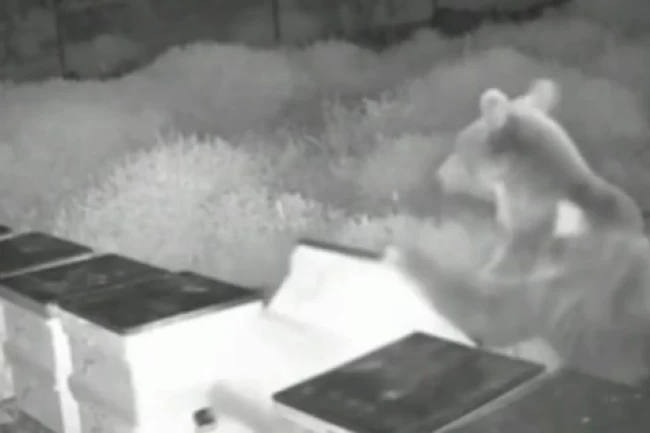 Düzce'nin Yığılca ilçesinde bir ayı, bal üreticisi Mahir Çalışkan'a ait kovanları gece yarısı parçalayarak balları yedi; olay güvenlik kameralarına yansıdı.