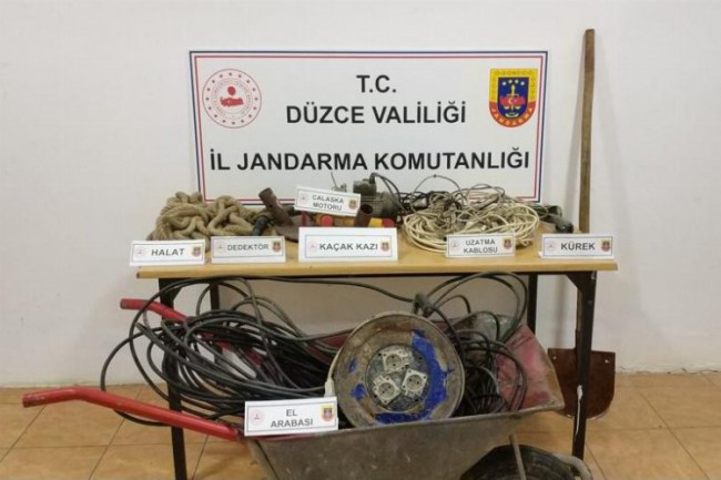 DÜZCE (İGFA) - Alınan bilgiye göre, jandarma ekipleri, Düzce ili Akçakoca ilçesine bağlı bir köyde bulunan bir fındık bahçesinden gelen sesler duyulması üzerine fındıklık alanda yapılan arama çalışması sonucunda *A.Ç. ,H.A. M.Z. isimli şahıslar define bulmak amacıyla izinsiz kazı yaptıkları esnada devriye ekibi tarafından suç üstü yakalandı.